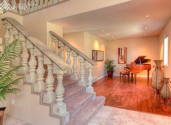 Fabulous custom home on 5 acres with unobstructed views of Pikes Peak, Garden of the Gods, Front Range and city lights. The property also features tall mature pines, Gambol Oak, rock formations and a large flat play yard or area for horses or garden. This gorgeous and unique home has an attached indoor heated pool house wing (2500 sq ft +) with a full sized indoor pool, spa, sauna, kitchenette, eating bar and bath. The Mother-in-law apartment is spacious w/ 2 bdrms, bath, kitchen, dining, living areas and fireplace.
