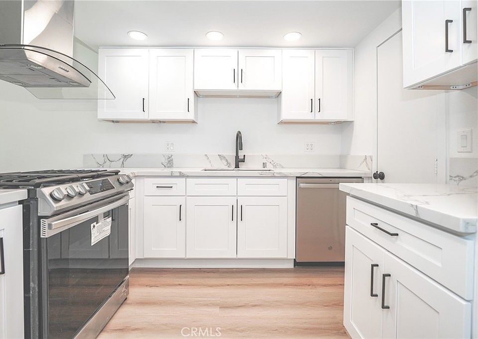 UPGRADED FIRST-FLOOR UNIT WITH 2 BEDROOMS AND 2 BATHS IN THE GATED COMMUNITY OF TUSTIN VERDES! Step inside a remodeled interior space. Once you step inside the unit, will immediately notice how nicely upgraded the inside is, with the wood flooring throughout and recess lighting. The living room is spacious and includes a fireplace, perfect to cozy up to on those cold evenings. Windows throughout to let plenty of natural light in. The upgraded kitchen includes stainless steel appliances, a quartz countertop, a stainless sink, a stainless steel dishwasher, and white color cabinets with plenty of storage space, kitchen is situated where you can look out to your outdoor patio space and dining area. Separate dining area, that can open up to the outdoor patio space, which is perfect when entertaining guests. Total 2 beds and 2 baths all upgraded with modern finishes. The primary bedroom includes its own primary bathroom that is upgraded with modern finishes. Detached 1-car garage. Conveniently located near many restaurants, shops, markets, and easy access to the 5 or 55 freeways.