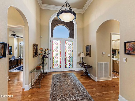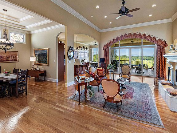 BEAUTIFUL PANORAMIC LAKE, MOUNTAIN, AND FOREST VIEW WITH A RELAXED LIFESTYLE!!! Savor every moment in this enchanting 4 BR, 4 BA immaculately maintained home with an Italian flair. Custom built with oversized rooms, thoughtful outdoor spaces and unique luxury touches to enhance your every day. Soaring 14' ceilings in the main living spaces -- custom cast stone fireplace, imported Italian tile accents and creative stained glass windows delight the senses! Gourmet kitchen features a built-in SubZero refrigerator/freezer, Thermador gas cooking, and large center overhang island with Bosch dishwasher. Formal dining room with double-trey ceiling accentuates the extensive crown moldings throughout the home. THE UNIQUE ATTRACTION OF THIS LOVELY HOME IS THE MAJESTIC FOREST, MOUNTAIN, AND LAKE VIEW FROM NEARLY EVERY ROOM!!! Outdoor spaces continue the Italian villa theme with stucco walls, classic paintings, and picturesque landscape. Gathering spaces include the oversized main level screened porch with custom tiled floor, enclosed lower tiled walk-out porch, and custom paver patios in both front and back; the front patio including a sparkling waterfall and koi water feature . A remote controlled retractable awning on the rear ground level patio allows for shaded patio space with an endless view that flows from the stone steps down your 300' treed backyard, across the pine and hardwood forest to the Smoky Mountains. The lower walkout level includes a recreation room with a 9' x 5' screen TV projector home theater, game room, wet bar and an over-sized guest suite overlooking your backyard view. Loads of walk-in shelved storage space!! And another bonus -- while you're relaxing and enjoying your beautiful home and the fantastic view, your HOA dues will be taking care of mowing the lawn!!!! Come view this unique home today!!!