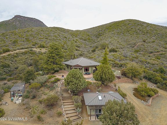 Stunning OFF GRID REAL ADOBE home with a private guest house that could be used full time, summer home or even a great VRBO. Property sits in the tall pines of a quaint community at an elevation of 5,600 ft and is just 36 miles from Prescott, 84 miles north of Phoenix, 97 miles south of Flagstaff. Prepare to be WOW'ed by this stunning custom-built, 1 bedroom, 2 bathroom with 18'' walls plus 1 bedroom GUEST HOUSE on 2 Acres bordering Prescott National Forest on two sides. This visually private property located right at the end of the road boasts million-dollar views of the Bradshaw Mountains for riding and hiking between Prescott & Crown King. On arrival, the landscaping takes advantage of the interesting Multi-Level Terrain - Architectural Block, Railroad Ties, Flagstone, Walls, Gated Yards. On the inside of this unique home you will enjoy 10' ceilings with exposed beams, brick floors, flagstone slab counter-tops and window-sills, and custom cabinets with raindrop glass. Wrap-around windows and skylights light the open living space. This home was built by an artist and it shows with its many unique features. Manage your indoor comfort with multiple fireplaces and ceiling fans. Gas or Wood combined with 16" thick Adobe Walls keep this home cozy and quiet. Relax with streaming TV or work fully remote here, Starlink Internet is up to the task. The Kitchen comes with a Viking Professional Range and other top-line appliances (even a wine fridge). In Summer enjoy bug-free grilling and dining on the enclosed screened back patio or the walled flagstone front patio (Fantastic Views) off the master bedroom. At the end of the day there is a walk-in tile shower in the main bath or soak by the fireplace in the large claw-foot tub in the master bath. The winding front staircase leads to the Guest House with a Living Room, 1 Bedroom & 1/2 Bath. It has double glass doors, lots of windows, glass blocks and skylights. Floors are Plank and tile, it has 2 gas heaters - very comfortable for family or guests ! Next find the Garage, a steel building with roll-up-door and room for toys, tools or the UTV. The last outbuilding is a steel shed for feed, firewood or to keep the ATV's dry. Don't miss the fully screened-floor-to-roof garden. It has irrigation and great soil beds. Deer/rodent/bird proof. Lastly, take a walk around the yard and find two gates leading into Prescott National Forest. Pine Creek is just a few steps away on the southwest side. Follow the trails for miles of hiking into the forest. If you prefer to ride or drive, this home is 1 mile from Historic Senator Hwy and endless dirt roads and trails in over a million acres of Forest. This 100% Off-Grid-Solar Property is a full-time year-round residence and is very well maintained and cared for. Have it all.. enjoy freedom, clean air and nature in the outdoors, a little more than an hour from the fifth largest city in America.