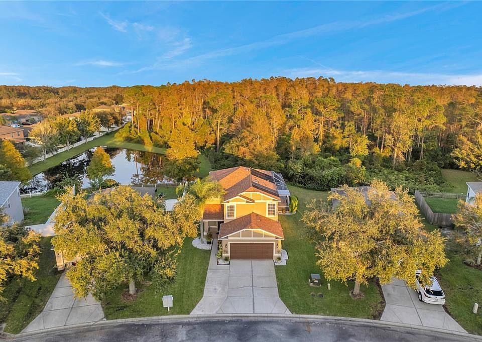 4 BEDROOM POOL HOME. CONSERVATION LOT. POND VIEW. Welcome to The Verandahs, a Gated Community with a Clubhouse, Fitness Center, Resort Style Pool & Playground amidst a picturesque setting of trees, ponds and serenity. Two-Story home that includes a bathroom, formal dining room, open kitchen with eat-in kitchen area, laundry room and a living room with high-ceilings on the first floor, with all remaining bedrooms (4) and bathrooms (2) upstairs. BACKYARD OASIS includes an area that is covered to keep out of the sun, along with a large brick paved lanai that features a HEATED POOL with SPA, several sunbathing spots, and child safety fence. ITEMS WORTHY OF MENTION; tons of NATURAL lighting throughout, Roof (2023), Solar Panels for Pool & Spa (all changed out in 2019) Washer & Dryer (2023), Water Heater (2024), HVAC system serviced 2X per year, several walk-in closets, under stairwell storage, linen closets in bathrooms, SPINDLE SWITCHBACK staircase, Spacious Driveway, Epoxy coated garage flooring with automatic garage door opener, additional refrigerator and worktable. OWNERS SUITE: walk-in closet, REMODELED bathroom with double sinks, Garden tub, glass-enclosed tiled shower, private toilet & linen closet. Easy access to cities like Tampa, St. Pete, Dade, Ocala & more. Short drive to Starkey Wilderness Park (camping & trails), US 41 & I- 75 and Buccaneer Bay in Weeki Wachee which is a natural springs water park (approx. 20 miles). Publix shopping center and amenities are minutes from your door. Tampa International Airport is approximately a 35–40-minute drive. Bike to the Suncoast bike trail or spend a day at the Sunwest Water Park right at your fingertips! LOW HOA ($55.00 per month). NO FLOOD INSURANCE required. Survey, video & floorplan available upon request. Golf Cart Friendly. Buy a Little Piece of Florida Now.