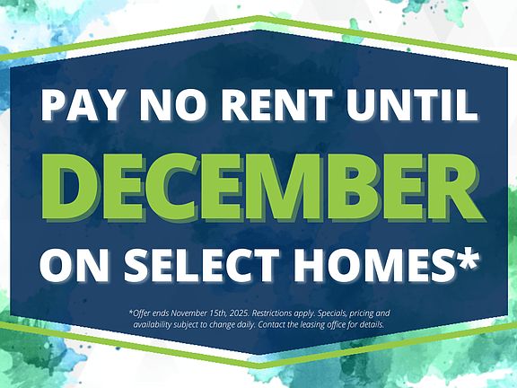 - Special offer! Pay no rent until December 1st on select homes! *Offer ends November 15th, 2025. Restrictions apply. Specials, pricing and availability subject to change daily. Contact the leasing office for details.