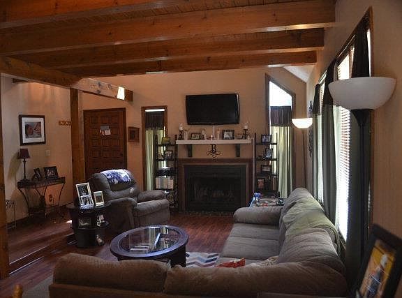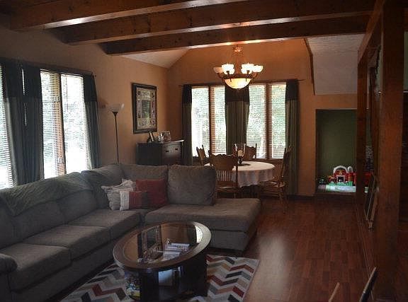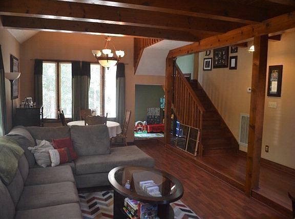 The large Great Room has a fireplace, lots of natural light and Dining Space. The loft space makes a great den area. Beautiful eat in kitchen with lots of cabinets and style. Rear deck, circular front driveway, wired storage building and many updates. The master bedroom is on the first floor and the other 2 bedrooms are upstairs.