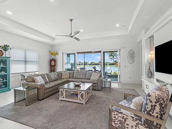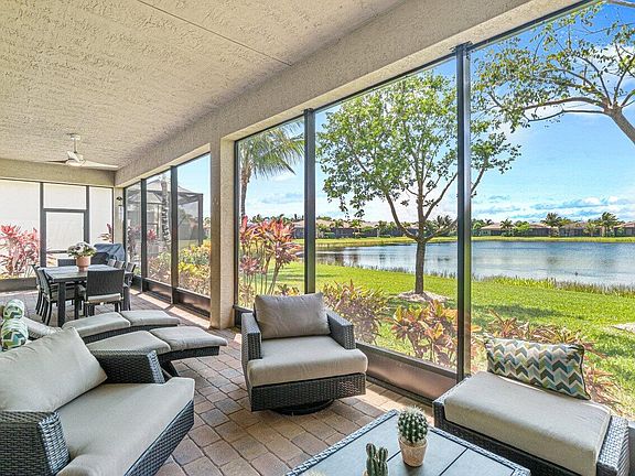 Gorgeous Vienna model features 2 bedrooms + den, 2.5 baths and beautiful lake views situated next to a pie-shaped lot offering highly desirable expanded space and privacy. Upgrade highlights include impact glass windows and doors, 24x24 rectified tile, tons of kitchen and bath upgrades, custom Great Room built-in, Hunter Douglas blinds throughout with large remote controlled Great Room blinds, custom closet systems, impact glass front door with keypad entry accessible from mobile phone, Coffered ceiling in the Great Room and Primary Bedroom, 2-foot garage extension with epoxy floor, upgraded landscaping and so much more. Valencia Bay is a highly sought-after 55+ community with tons of amenities including a cafe. Cable, Internet, exterior painting and alarm monitoring included in HOA fee