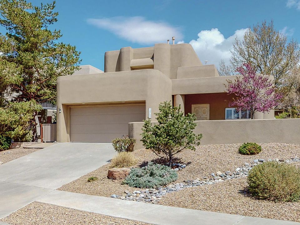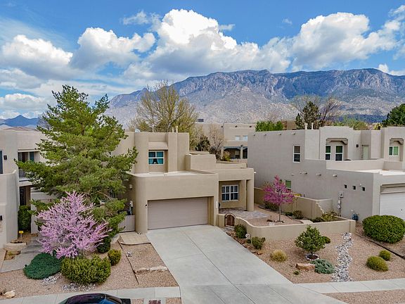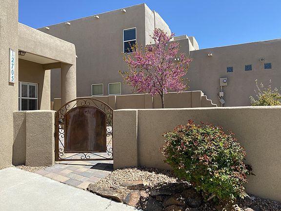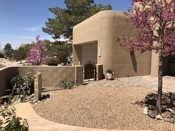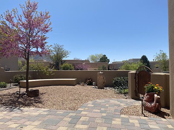 Welcome to this beautiful & immaculate kept home. Front courtyard with water fountain greets you as you walk to the handcrafted ornate front door. High ceilings, natural lighting, rich dark wood floors and tile throughout. Oversized master suite is with private balcony. Ensuite bath offers newer spa tub, vanity, flooring and shower updates. Kitchens toffee colored cabinetry, quartz countertops, s/s appliances, island & garden window is spacious. Hall bath has been remodeled and updated. Gas fireplace & plantation shutters promote a cozy living space w/piano hinged patio door. Backyard oasis is private with heated swim spa, automated awning and gazebo. Over 140k updates within the last 5 years. Chamisa Trails location is ideal with the foothills out your front door and High Desert living.