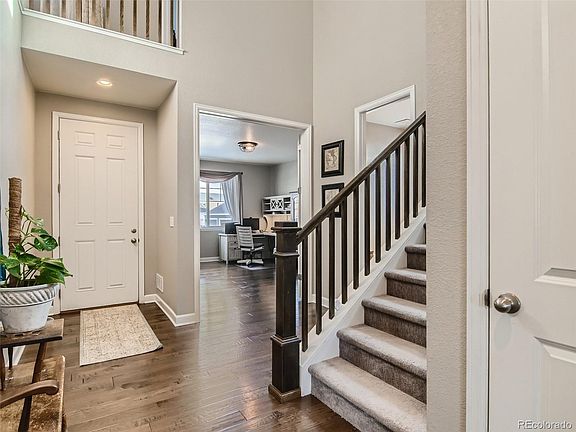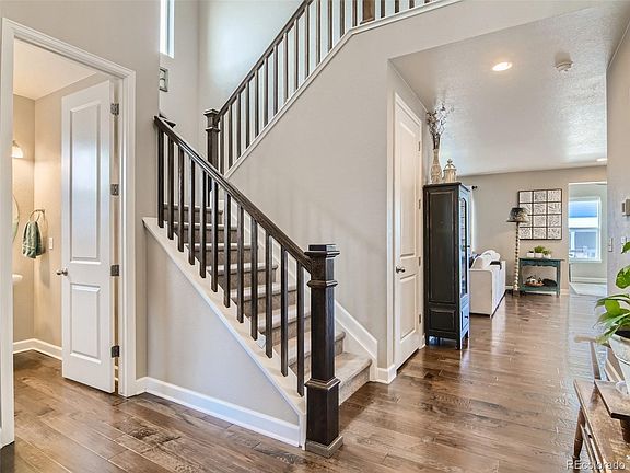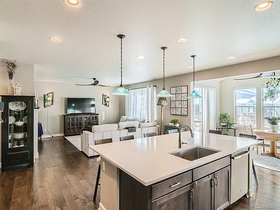 You will fall in Love with this Beautiful Richmond Coronado home, floor plan provides spaces for working and entertaining. Just off the grand entry is a bright spacious study and powder room. At the back of the home, enjoy an open great room, dining room and gourmet kitchen, complete oversized center island, quartz countertops, gorgeous pendant lighting, Black Stainless Steel appliances, double ovens, gas cooktop, 6 island stools. Bonus Sun Room to complete the gourmet kitchen adding valuable sq ft for entertaining, reading, hobbies, crafts, loaded with sunlight!!! Walk in pantry and mudroom with direct entry from oversized 3 car garage. Two Secondary bedrooms with walk-in closets, a generous loft and bath is located upstairs. Custom fans through out home. Laundry room loaded with cabinets complete with laundry sink. Private Primary Bedroom with a show stopper walk in shower, dual sinks, oversized walk-in closet. Full unfinished basement awaits your creativity. Beautiful Professionally finished landscaping, 16x10 motorized awning w/remote, raised garden beds with a mix of perennial food and flowers as well as space for annuals. Close to dining, shopping, entertainment and other amenities. This community features extensive trails, wide open spaces, and twin sapphire lakes all set against backgrounds of deep blue skies and Colorado's breathtaking sunsets!