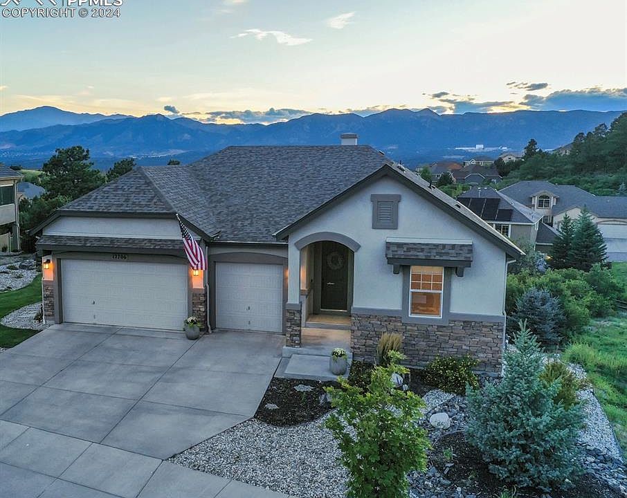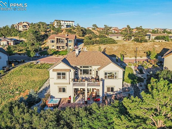 Nestled in a tranquil cul-de-sac on a sprawling 1/3 acre lot, this Colorado-inspired dream home boasts elegance and panoramic views. The main level offers a seamless open floor plan with two bedrooms, facilitating convenient living. Revel in entertaining on the oversized deck with gas plumbing and speakers, providing the perfect backdrop for gatherings. The home features magnificent details such as soaring ceilings, wood beams, and a stone fireplace that enhance the breathtaking views. Abundant windows flood the space with natural light, framing the picturesque surroundings. The gourmet kitchen, a chef's delight, showcases double ovens, a custom buffet with floating shelves, herringbone backsplash, quartz counters, and a Butler's pantry. The primary suite is a retreat with a picture window and deck access. The spa-like main bath boasts ample granite counter space, separate vanities, a large spa tub, and a dual-headed shower. The walk-in closet is a dream with built-ins and even a window. The walk-out basement offers a second living area with 9-ft ceilings, surround sound, a wet bar, and more views. Step into the private backyard oasis with a covered patio, commercial-grade custom fire pit, hot tub, and native landscaping. Additional bedrooms, a bathroom, and a gym space add to the home's versatility. The gym space can be finished to your specifications as it is pre-plumbed and electrical available in the space. Conveniently located in Flying Horse, it provides easy access to entertainment, restaurants, and healthcare. Membership to Flying Horse resort and club is available separately, completing the luxurious lifestyle this home offers.