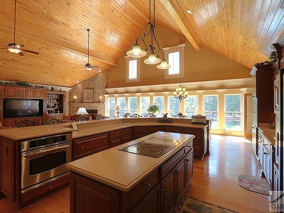 This elegant custom built all brick ranch on full bsmt. is situated on 7+ acres. The breathtaking 2-Story Foyer opens to formal living & dining rms. Soaring ceilings greet you in the enormous family rm., w/2-sty stack stone fireplace & custom built-in entertainment center. The custom kitchen is open to family rm. & features solid surface counter-tops, lots of cherry cabinetry, walk-in pantry, & cabinet style appliances. The windowed breakfast area overlooks a well landscaped back yard w/in-ground pool & a challenging 62 yard par three. The master features 2 separate baths & 2 Huge closets. This split bedroom plan has 2 big bedrooms w/full baths. The bsmt. has 2 Bedrooms, 1 bath, full Kit. & Family Rm.