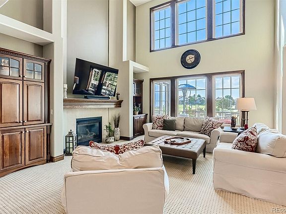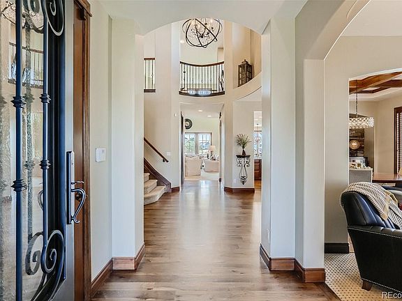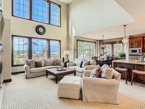 Discover an unparalleled gem nestled in the exclusive Estates of Buffalo Ridge gated community, where ownership is not just a privilege but a passage to the extraordinary. This gorgeous home is one of only a handful perched above The Ridge at Castle Pines North signature hole with unobstructed views of the Denver Tech Center skyline. From the moment you walk through the oversized custom door, you are greeted with a warm ambiance, from the walnut hardwood floors & crystal chandeliers to the stone fireplace that embodies rustic luxury. The heart of this home beats in its chef’s kitchen, boasting high-end appliances & a grand island that stands as a beacon for gatherings, which unfolds into the great room, bathed in light from oversized windows, & flows seamlessly to the outdoor living space. Enjoy mornings watching the wildlife play & the sun rise across DTC, & quiet evenings with breathtaking sunsets & city lights twinkling on the horizon from your oversized TimberTech deck. Amaze your family & friends with incredible meals cooked on your outdoor kitchen.The main-floor master suite is a tranquil haven with vaulted ceilings, abundant natural light, dual closets, & an opulent five-piece bath with a jetted tub for unwinding in bliss. Ascend to the upper level, where two additional bedrooms & a loft adorned with a built-in desk await, promising quiet corners for study & reflection. The basement, designed as the ultimate entertainment hub, has an oversized guest suite, theater room, two 55” televisions, pool table, optional game table, & kitchenette equipped with a fridge, dishwasher, ice maker, & wine fridge, perfect for entertaining or generational living. Embrace the chance to own this mountain-style residence, a blend of luxury & natural beauty, moments away from the vibrant life of Denver. This is not just a home but a lifestyle offering, where every day is an invitation to live the extraordinary.