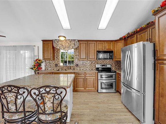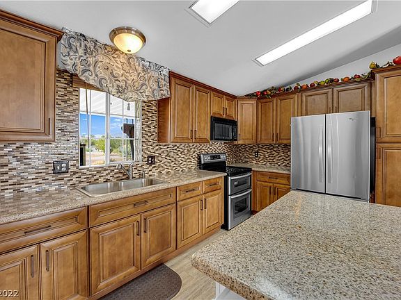 Best deal in the beautiful Pahrump Valley. Large Corner lot, 1 Full Acre, Nearly 2000 Sq.Ft. with 4 bed / 2 bath, split floor plan, beautiful mountain views in Southern valley. Upgraded home has custom features 2-way fireplace in the great room and new kitchen with soft close cabinets, stainless steel appliances and a professional double oven. Open living areas feature vaulted ceilings, skylights, laundry room with storage and extra fridge, new paint. Fully fenced front and back yard, custom 20×15 insulated garage/workshop shed and carport. Lush green grass fruit trees and jeweled agave plants for your gardening pleasure in the back yard, zoned 4