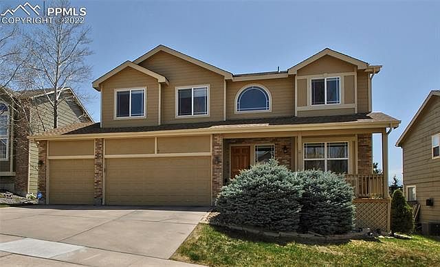 FANTASTIC PIKES PEAK!! and Front Range views from the Air Force Academy to Cheyenne Mountain. Easy I-25 access to this charming 2 story with 4 big bedrooms and big living areas. The hardwood eat in kitchen is complete with granite countertops and all the appliances and walks out to the composite deck. The vaulted spacious family room is accented by gas fireplace plus formal living and dining areas. Luxury master suite with adjoining study, fireplace and luxury 5 piece bath. Basement has another fireplace in the huge rec room plus private bedroom suite. Custom blinds, Central A/C, Washer/Dryer, Newer exterior paint plus 3 car garage with Custom cabinets. All in District 20 schools.