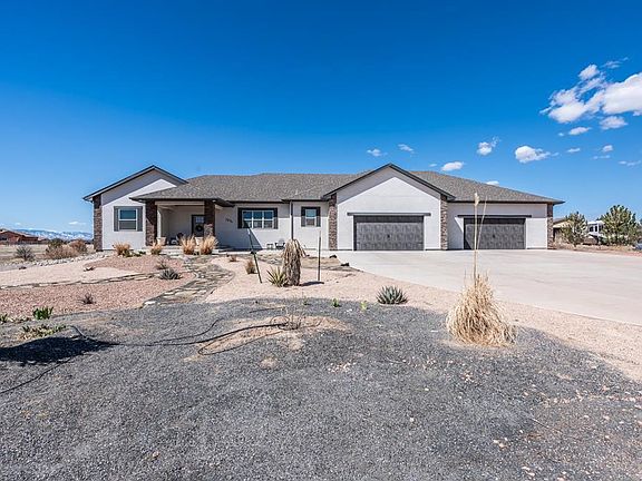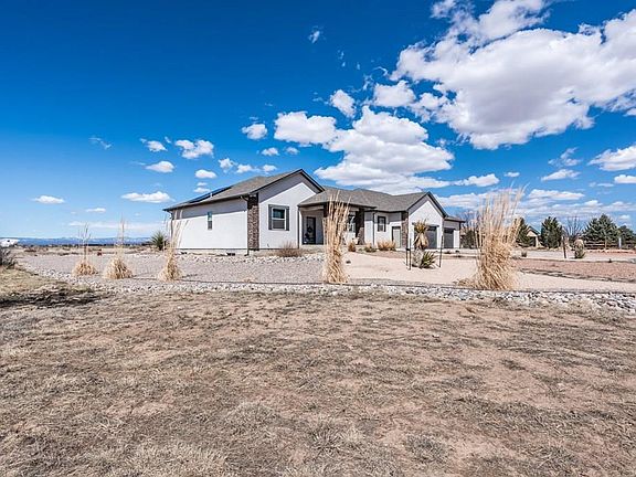 Gorgeous 3 bed 2 bath home in Pueblo West that sits on a large 1.8 acre lot near the reservoir with little traffic plus 30x70 attached garage (on the longer side) has 8 ft garage doors and 12 1/2 ft walls that are insulated.! Can hold 4 boats!! Great curb appeal with grand front porch, stone accents, and synthetic stucco exterior. Open-concept in main living area, with in-wall 5-channel speakers and spray foam insulated attic. Kitchen features commercial LVT floors, quartz counter tops, soft close cabinets and drawers, over-sized pantry, premium black stainless appliances and Delta plumbing, and an island with second sink. Primary suite is spacious with lots of natural lighting. Attached master bath features a walk-in shower with a premium glass shower door and walls and a custom-built poured shower pan with stone pebbles. All bedrooms include walk-in closets! Unfinished basement offers many options for expansion. Other interior features include: Ceiling fans, vaulted ceilings, and premium Jeld Wen windows. Huge backyard has a 30x30 covered porch. Concrete pad and wiring are already in place for a hot tub next to the porch. On the coldest winter days, garage stays about 45 degrees warmer than outside temperatures. Mini split air conditioning had the garage 68 degrees on July 4th, 2023. 400 amp service makes home and garage combo a great place to live. Solar panels produce 50 to 55 kWh per month. Near highly sought-after schools and entrance to Pueblo Reservoir.