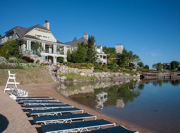 Incredible home, located just steps away form the private Bay Harbor Yacht Club beach!! This property offers sweeping views of Bay Harbor Lake and the channel leading out to Lake Michigan. The elegant two~story foyer makes a statement leading in to an open living area, and a gourmet kitchen. In addition this property features a lower level family room with fireplace, covered outdoor patio steps from the waters edge, and four bedrooms, each offering a full bath and covered porch, perfect for entertaining..