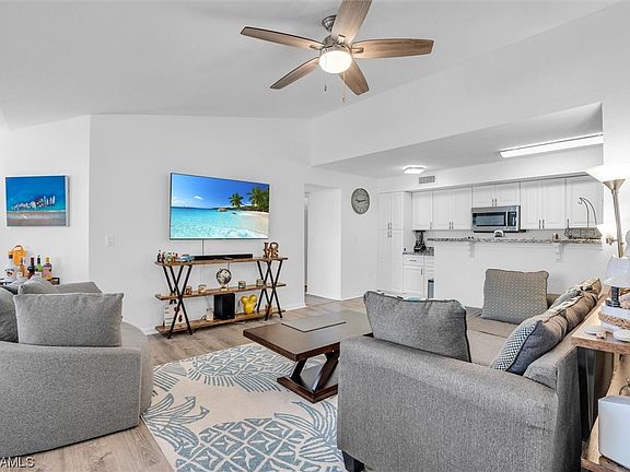 Welcome to this stunning fully furnished 3-bedroom condo with vaulted ceilings, ideally located just a short 20-minute drive away from the beautiful Fort Myers Beach and Sanibel Island is just a little further. This contemporary residence offers a perfect blend of style, comfort, and convenience, making it an ideal choice for those seeking a coastal lifestyle. Facilities amenities include, tennis court, 2 pools, and pickle ball. Step inside and be greeted by an inviting living space adorned with modern furnishings and tasteful decor. The open floor plan seamlessly connects the living, dining, and kitchen areas, creating a spacious and airy ambiance. The well-appointed kitchen is equipped with top-of-the-line appliances and ample storage, inspiring culinary creativity. Retreat to the three well-proportioned bedrooms. The master bedroom boasts an en-suite bathroom, ensuring privacy and relaxation. Indulge in the delightful amenities this condo community has to offer, including a swimming pool, fitness center, and lush landscaped grounds. With its enviable proximity to the beach, you can easily enjoy sun-soaked days, beach strolls, and breathtaking sunsets. Don't miss the opportunity to call this fully furnished 3-bedroom condo your home and experience the best of coastal living.
