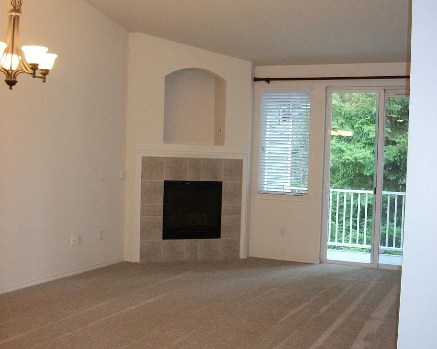 Woodlands Condos. Immaculate top floor unit! Updated 2 bedroom, 2 bath unit. Approx 970 sq ft. Light and bright large living room with gas fireplace and vaulted ceilings. Open kitchen with maple cabinetry, tile counters and eating bar. Fresh paint throughout. Laundry w/custom cabinets and full size washer/dryer. Private balcony overlooking a greenbelt with storage. This unit also includes a private single car garage. w/s/g included in rent. Easy access to Boeing, shopping, and I-5. Mukilteo schools. No Smokers. Pet Considered. $200 Move-In Fee