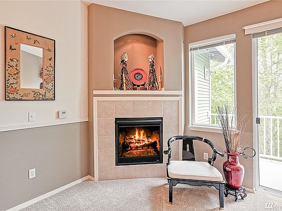 Upgraded top floor condo in highly sought-after Woodlands community! Open concept living w/vaulted ceilings, all appliances & amazing storage. Lrg master w/dual sink ensuite bathroom, lrg walk-in closet & lrg 2nd closet. Remote-control gas fireplace w/built-in media center & CAT5 wiring. NEW carpet/paint/sinks/toilets. Balcony & master both overlook tranquil & private NGPA w/babbling brook. Includes one-car garage. Mukilteo schools. Close to Boeing & all amenities. NO RENTAL CAP/NO ASSESSMENTS