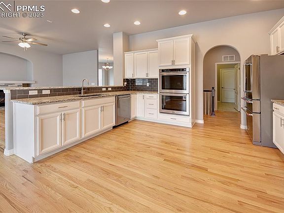 Welcome Home! Your search for the perfect ranch home is over. Here are some upfront highlights. Four bedrooms and a french door study/office. Large main level bedroom suite with 2 closets and 5-pc bathroom. Fully finished basement with wet bar, wine rack & mini fridge. Theater room w/ soundproof insulation and 5 speakers pre-wire. White satin finish on kitchen cabinets, Maytag gas range with double wall ovens and single bowl composite sink. Hardwood floors in dining room, great room, and both main level bedrooms. Utility sink in the laundry room. Whole house water filter system. USB outlets. Outdoor gas line. Ceiling fan pre-wire at covered and extended patio. Security system, shed and HOT TUB! Walking in the front door you’ll find an open floor plan with tons of natural light. The main level features beautiful hardwood floors. A formal dining room, 2 bedrooms plus a french door study/office positioned perfectly on the main level. There is large gourmet kitchen that features stainless appliances, double ovens, gas range, granite slab counters, single bowl composite sink, eat up counter, storage pantry a breakfast nook that walks out to the COVERED back patio. The main level bedroom suite has attached 5-pc bathroom with raised double vanity and 2 closets! Fully finished basement with 2 additional extra-large bedrooms, wet bar with wine rack and mini fridge and huge theater room already pre-wired for surround sound. All bathrooms include granite slab counters with double vanity in basement. Central AC. Beautiful landscaped and fully fenced. Many community amenities: Golf course & restaurant. 42,000-square-foot fitness center and full basketball court. Indoor & outdoor pools, winding trails w/ mountain views, shopping and dining right in the neighborhood! Neighborhood parks and a 215-acre regional park w/ Dog Park. A great location if you need to commute to Schriever AFB, Peterson AFB, and Colorado Springs. You don't want to miss this spectacular home!