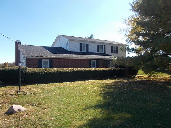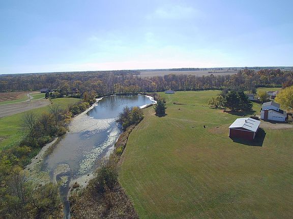 Grand site with 2 acre pond, rolling hills. Home is well built with large kitchen, dining, living and Family room down and 4 bedrooms and 2 full baths up. Recent roof, recent central air unit. Includes 30x52 pole building with concrete floor, and small shed by pond. All replacement vinyl windows