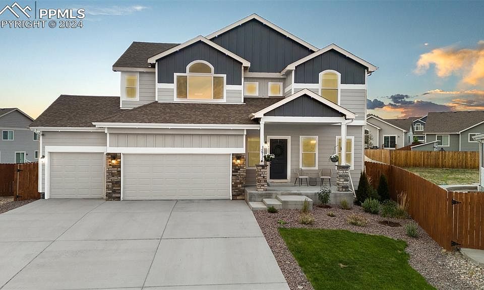 Welcome to your dream home in the desirable Golf Course Community of Meridian Ranch!** This immaculate 6-bedroom, 4-bathroom, 4-car garage home is perfectly tucked away in a cul-de-sac with stunning mountain views. It shows like a model home with upgrades throughout. This home boasts amazing curb appeal with a covered entrance, extra parking, and a huge lot. It is conveniently located near the community center, pool, parks, and trails. The entrance welcomes you with high ceilings, open railing, abundant natural light, and a flex space/office on the main level. The open floor plan seamlessly connects the gourmet kitchen, dining area, and great room. Engineered hardwood floors, granite countertops, an oversized granite island, 42” cabinets, stainless steel appliances, a gas range, accent walls, a stone-surround fireplace, custom-built exterior lighting, and customizable interior lighting add to the luxurious feel. Additional features include tinted windows, a smart thermostat, security cameras, and a whole-home water softener. Step outside from the main level onto the expanded patio with a gazebo, retractable shades, and an exterior TV. The backyard is landscaped with mature trees, beautiful plants, and thoughtful design elements like custom window well coverings and a fenced dog run with artificial turf. The views and entertaining space are perfect for social gatherings. The upper level has four bedrooms, including the primary suite with a seating area, two closets, and an en-suite 5-piece bathroom. There are three additional large bedrooms, a separate laundry room, and a second full bathroom on this level. The finished basement includes a fully equipped wet bar, a large rec room, two additional bedrooms, and a fourth full bathroom. The 4-car garage offers ample room for your cars and includes a garage service door and custom built-in shelving for storage. Near USAFA, Peterson & Schriever SFB, shopping, dining, and grocery stores. This is a must-see home.