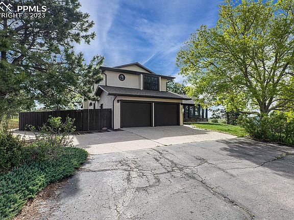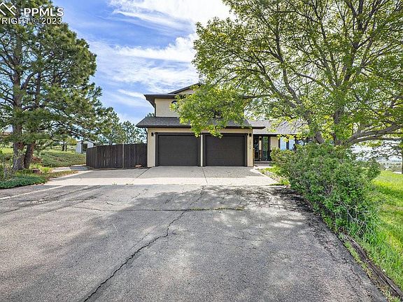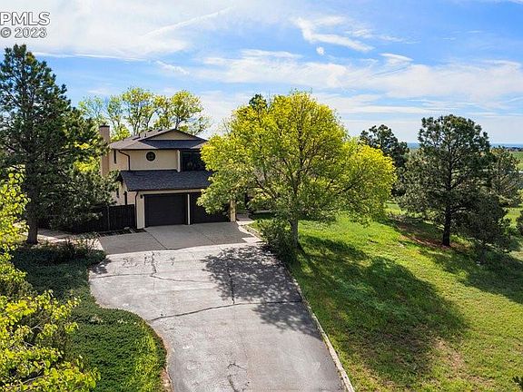 Picture yourself living in the quietest of settings with rolling grassy meadows spread out before you & mature trees peppering your property. Pikes Peak is laid out before you & views of the neighborhood expand to the back. Fully fenced including electronic gate means your pets, children & YOU can roam free on the privacy of your 2.5-acre, corner-lot property. This equestrian community offers easements for riding & is only a short ride over to the neighborhood Latigo equestrian center which boasts indoor/outdoor riding opportunities, activities, shopping & dining! The home itself is a fantastic open floor plan & has been meticulously cared for by one family. You are first greeted by the huge living room & dining room areas, made to feel even larger by the vaulted ceiling & enormous windows showcasing the amazing view. The spacious kitchen boasts a nicely sized eat-in area, useful island, pantry cabinet with rollouts & walk-out to back A cozy family room sits adjacent, with wood-burning stove and access to the laundry room & half bathroom. Or access the amazing sunroom in back with huge sliding doors & screen doors, built-in cabinetry, tons of windows & skylights! From the sunroom is a unique enclosed patio, fully private with large tree and tile floor! Back inside, head upstairs to find three bedrooms & two bathrooms, including the large master suite with window seat, walk-in closet & attached ¾ bathroom. The other two bedrooms are also nicely sized with larger closets & the full-size bathroom is accessible from the hallway. Professional landscaping surrounds the home & has been properly maintained (the trees have also been sprayed) & kept watered with the automatic sprinkler system. The “casita” out back could serve many purposes: a shed to store toys/yard tools, a playhouse, a man/woman “cave” etc. Both the Casita & the main house have a new roof (2022). This home and this lovely property are ready for a new family to love it and make it their own!