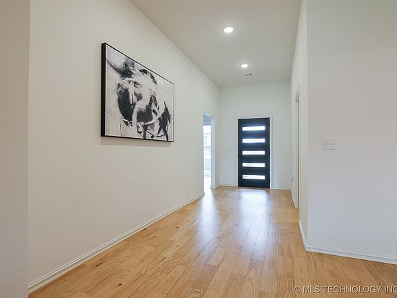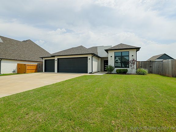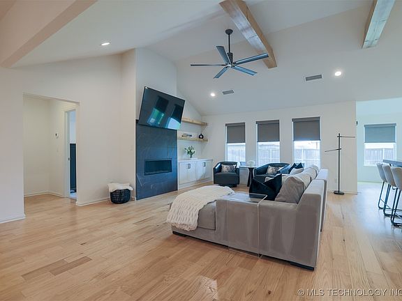 Welcome to this beautifully designed 3/bed/2bath/3car home located in desirable Addison Creek! This home combines spacious living with modern design. The open-concept floor plan features wide plank white oak flooring, a cathedral ceiling accented by wood beams, a modern fireplace glass, and built-ins with open decorative wood shelves. The kitchen is light and bright, featuring a timeless black leathered textured granite countertop, a gas stove, large island with barstool seating, and walk-in pantry. The primary suite includes an ensuite bathroom with dual sinks, marble tile shower with separate soaking tub. The large primary walk-in closet conveniently connects to the spacious laundry room. Enjoy the covered back patio with gas, electrical, and cable already run and ready for your new grill and TV - making the backyard the perfect hangout for relaxing or entertaining! Full stucco, full gutters, programmable sprinkler system, and security system. In addition, the neighborhood has ALL the amenities, including 2 pools, clubhouse, fitness center, trails, and a playground - and it is located in highly sought after Bixby North school district!