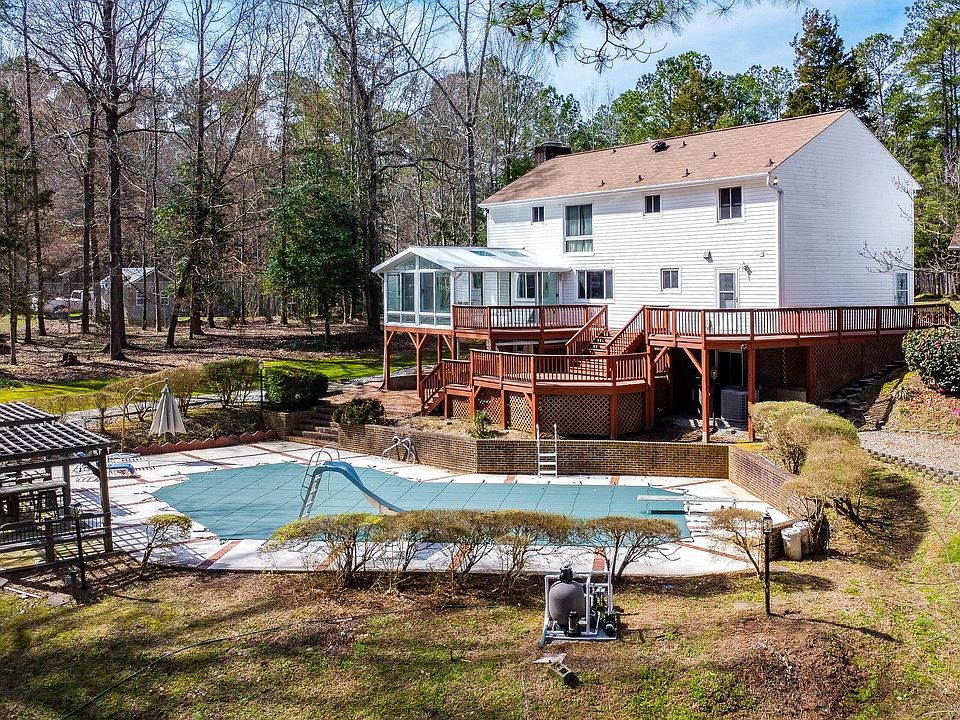 Welcome to your ULTIMATE entertainment haven! Enter through the beautiful custom wrought iron double doors where the foyer sets the tone for elegance. This 4-bedroom, 3.5-bathroom home and an incredible 5th room/flex space with a huge walk-in closet makes this a great bonus room, or home office, etc. and is tailor-made for unforgettable gatherings. On the main floor, a grand dining room, gourmet kitchen with side-by-side Subzero refrigerator and freezer and expansive living area await, alongside practical amenities like a spacious laundry area and convenient back pantry. A full basement featuring a secondary kitchen makes hosting a breeze. Luxurious touches include bidets in every upstairs bathroom, custom-built bookshelves, and a cedar closet. The primary suite is a retreat with a jacuzzi tub and separate shower. Outside, a spacious front porch overlooks the circular driveway and expansive front yard, secured by a 12-foot security fence. Step onto any of the three-level decks or choose to relax in the ceramic floor-tiled sunroom. Or you just might prefer the backyard. It boasts of a hot tub, pool, bonfire area, and poolside pergola. This property offers endless possibilities, whether you're into cars, DIY projects, or gardening. Built with love and attention to detail this ''once-in-a-lifetime'' is retreat waiting to be cherished. Don't miss the chance to make this extraordinary property yours!