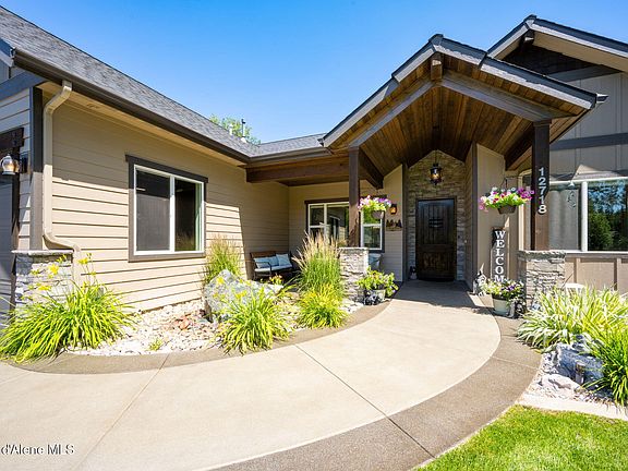 Luxury meets utility in this Forest Ridge Estates home, set on a custom landscaped .65-acre lot in Hayden. Built in 2019, the property includes a 30x40 heated and finished shop with oversized doors and mezzanine storage, a 3-car attached garage, and extensive concrete work that connects multiple outdoor entertaining areas. A covered bar is built for year-round use, featuring a built-in grill, griddle, beverage cooler, and generous seating. Inside, this single-level, 2,161 sq ft Northwest Craftsman boasts 4 bedrooms, 3 bathrooms, 10' ceilings, granite countertops, and large sliding doors that open to the expansive outdoor living space. The primary suite includes patio access, a soaking tub, and an oversized custom-tiled curbless shower. Surrounded by mature trees and located just minutes from Hayden Lake, golf, and North Idaho recreation, this home balances comfort, craftsmanship, and everyday convenience.