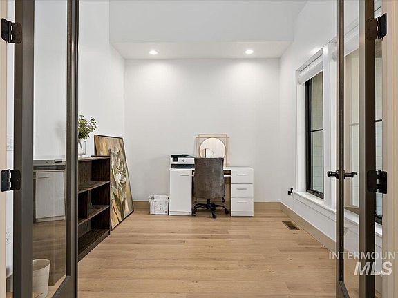 Attention to detail in every last feature accentuates this custom built home in South Nampa near Lake Lowell. From the engineered hardwood flooring to the custom cabinetry throughout, no detail has been overlooked. GE Cafe line appliances (fridge stays) adorn the custom kitchen which also features custom quartz countertops, oversized upper cabinets, double ovens, gas range top, pot filler, enormous butler pantry complete with tons of shelving and built-in microwave. The secluded master suite features coffered ceilings, expansive walk-in closet, oversized soaker tub, walk-in shower, dual vanities, HEATED FLOOORS and private exit to the east facing covered patio. Additional features include central vac, fireplace, custom window treatments, huge RV garage, hot water hose bid also in the garage for washing the car, pets and/or boat, stamped concrete, separate office/den and ample sized spare bedrooms. No detail has been overlooked!