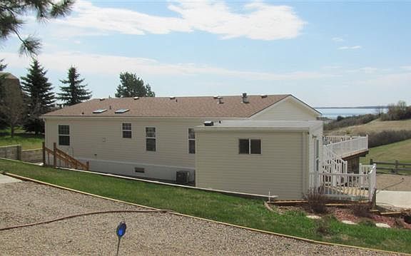 2002 Manufactured home with detached garage, shed, bathhouse for your guests who park their camper on the pad for the weekend. This property has a nice view of Lake Sakakaewea's Hidden Bay. Boat ramp at Camp of Cross for fishing and boating 2 miles to the west. Less than 10 miles from Garrison in a year around lake development.