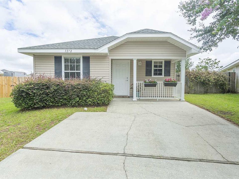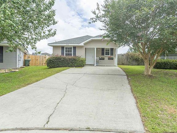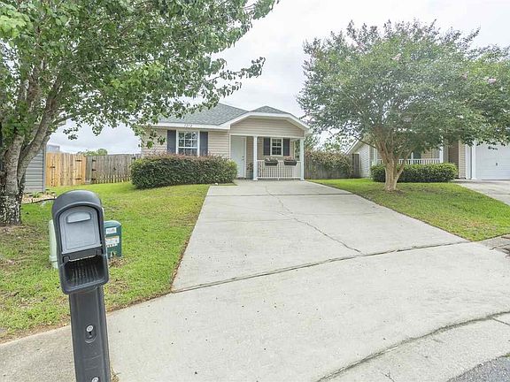 Adorable 2 bed 2 bath home situated in a quiet culdesac. Location is so convenient to Navy Federal, I-10, and military bases. Open concept as soon as you walk in the door which is wonderful for entertaining. Kitchen opens to the great room with wood laminate flooring. Kitchen equipped with breakfast bar, electric stove, dishwasher, refrigerator and loads of counter space and cabinets. Great room leads into a cozy sunroom with glass french doors. Bedrooms are sizable with ample closet space and wood laminate flooring. Home has vinyl siding and sits on one of the largest lots in the subdivision. The back yard is privacy fenced with open patio and plenty of room for a swimming pool. Out front you have a two car driveway and a covered front porch. NEW HVAC in 2020 and Roof approximately 5 years old. Home comes with a transferable termite bond. Community has a couple playgrounds, picnic areas and sidewalks. Don't miss out!