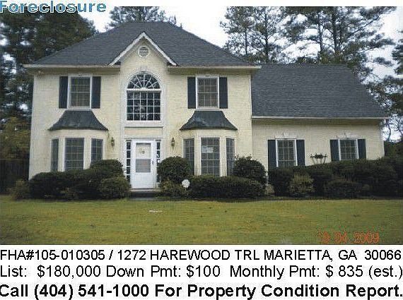 105-010305 Type: Residential - Single Family MARIETTA, GA 30066 County: COBB List Price: $180,000 As-Is Value: $180,000 Beds: 4 Baths: 2.5 Family Room: 1 Kitchen: 1 Dining Room: 1 Living Room: 1 Den: Units: 1 Parking Structure: Built-In Garage Year Built: 1994 HOA Fees: $330 HOA Frequency: Annually 100-Year Floodplain: No 203K Eligible: Yes