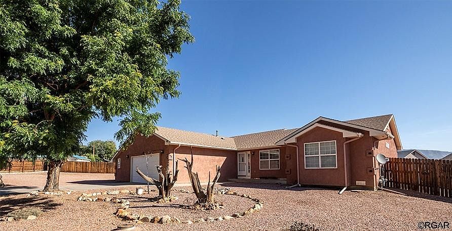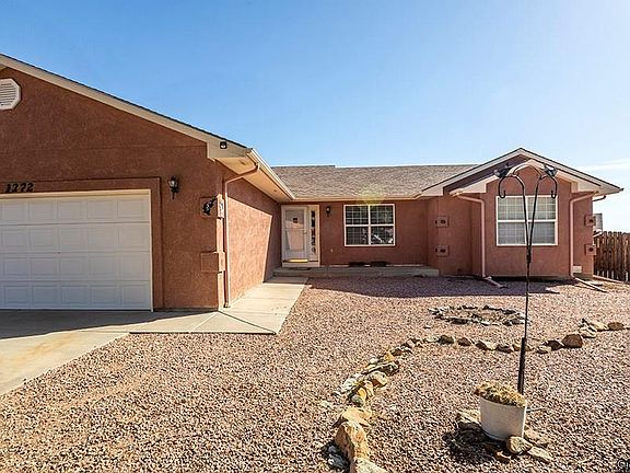 Mountain views surround this beautiful stucco home that sits on .369 acres of rocked, wood fenced yard with easy access for RV, boat, & ATV parking. Front porch and back patio sitting area, w/sliding glass doors off both the primary bedroom & the dining room, also add to your viewing opportunities. You enter the home via a door w/stained glass window & side panel into a tiled foyer & are met by cathedral ceilings & plant shelving. An attractive chandelier graces the dining room. Whirlpool & Hotpoint appliances in the kitchen & quality cabinetry as well as a pantry make meal prep easy. A breakfast bar separates the kitchen from the dining room. Split bedroom design features the primary bedroom with a 6'9 "x 8'5" closet & skylight in the 2 vanity bathroom with walk-in shower on one side & two additional bedrooms (room length closets) on the other side. Seller is offering a $3000 flooring allowance bc of current carpet condition in main part of house. Over-sized two car garage has a 10'11" x 9'2" attached workshop with shelving & even a window. Garage also has a large storage cabinet. Sale includes washer & dryer. Come appreciate this lovely home on a quiet cul-de-sac.