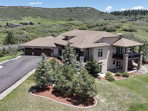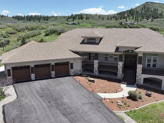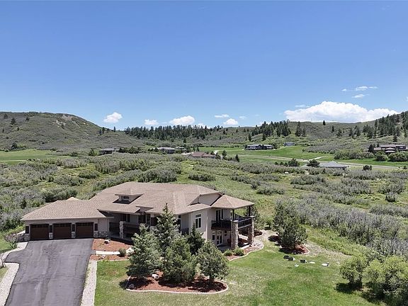 Welcome to this beautifully remodeled custom Ranch-style home, perfectly situated at the end of a cul-de-sac in prestigious Bell Mountain Ranch. Nestled on 5.05 acres, this exceptional property offers panoramic views from every level, nearly 5,000 sq ft of thoughtfully designed living space, and an expansive wrap-around deck to enjoy Colorado’s beauty year-round. Enter through custom double doors into a stunning foyer with a barrel ceiling that sets the tone for the home’s craftsmanship. The main level features soaring ceilings, new engineered hardwood floors, and an open-concept layout. The gourmet kitchen boasts floor-to-ceiling custom cabinetry, Quartzite countertops, high-end stainless appliances, pot filler, filtered insta-hot water, and a large island ideal for entertaining. The living room offers a dramatic remote-controlled gas fireplace, built-ins, and a wall of windows and French doors that lead to the covered deck. Enjoy breathtaking views of Devils Head and the Rockies, with premium Trex decking, tongue-and-groove ceilings, recessed lighting, Bluetooth audio, ceiling fan, and a natural gas fire table plus additional gas hookup. The main-floor primary suite features a spa-like 5-piece bath, walk-in closet, and private deck access. A second bedroom with built-ins and a Murphy bed also functions as an office with its own deck walkout. The walk-out basement includes a large great room, second full kitchen/bar, 3 additional bedrooms, 2 full baths (including Jack & Jill), and abundant storage. The covered stamped concrete patio includes two gas hookups, recessed lighting, T&G ceiling, Bluetooth speakers, and a ceiling fan. Car lovers will appreciate the oversized, heated 4-car garage with epoxy floors, new doors and openers, attic storage, wired audio, and an attached heated workshop with built-ins, a mounted TV, and full audio system. A newly paved driveway and new septic system completes this exceptional property with privacy, functionality, and views.