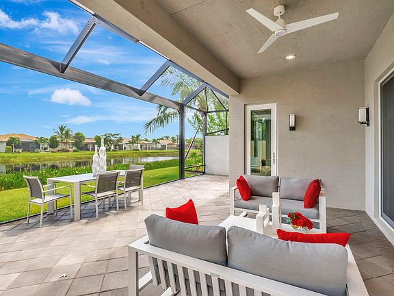 Welcome to the most pristine and gorgeous FURNISHED waterfront home in Valencia Bay. This home is truly one of a kind and shows like a true model. It is the Bimini model which has three full bedrooms, three full baths and a beautifully appointed office with stunning white built ins. An extended and covered patio overlooks a beautiful lakefront lot. Crown molding and impact glass throughout the home. From the moment you enter this home you will see the attention to detail that went in to each selection. The floors throughout are stunning white 24x 24inch white tile. No carpet anywhere. The price of this home reflects a long list of upgrades as well as the furniture, art work and accessories, 2 fireplaces.You can truly move in with ease to enjoy Valencia Bay lifestyle for this coming sea Valencia Bay is a fabulous "over 55 "community with 6 tennis courts and 6 pickle ball courts. It has a billiard room, card rooms, fitness center and resort style pools.The poolside cafe serves breakfast and lunch everyday. It is a wonderful active lifestyle that awaits you. Buyer is to pay 3 months HOA due at closing for a capital contribution.