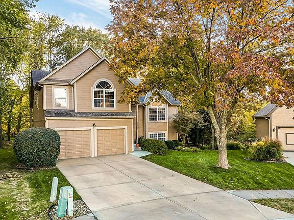 Beautiful home in Bradford Falls! Located in the heart of Olathe close to lots of amenities. Lovingly cared for one owner home in quiet cul-de-sac backing to wooded lot! Spacious open floor plan with vaulted ceilings. New refinished hardwood floors in the entryway and kitchen. New interior paint. Kitchen features granite countertops, newer black appliances, pantry and breakfast area. Beautiful floor to ceiling fireplace in living room with ceiling fan. Spacious finished walkout lower level with large windows for lots of natural light with 4th bedroom and 3rd full bath. The lower level also features a large bonus room currently being used as an office with garage access. Private master suite on separate level with vaulted ceilings, double vanities, soaker tub and large walk-in closet. Updated baths. Relax on the large deck overlooking the private backyard. Sprinkler system and storage shed. Great location and Olathe schools!