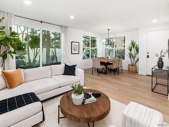 Welcome to Comfort and Style in Montemar, a premier Carmel Valley community. This tastefully updated 3 bedroom twin home features 1,684 square feet of living space, Provenza luxury vinyl wide-plank flooring, recessed lighting, modern light fixtures, powder bathroom with new vanity and sink, and new AC unit. The bright living and dining rooms overlook the quaint patio which includes mature trees and fresh flowers and bark. This simple yet inviting space is perfect for relaxing outdoors. The kitchen features stainless steel appliances, white cabinets, new quartz countertops, matte black apron sink and faucet, and cozy breakfast nook. The 2 generously sized secondary bedrooms include new plush carpet and a jack-and-jill bathroom with new tile flooring and a beautiful tile shower. The primary bedroom also features new plush carpet and opens to the newly remodeled primary bathroom. Updates include a new double vanity with stylish mirrors and updated light fixtures, free-standing bathtub, stand-alone shower with beautiful designer tile and rainfall shower head, and a large walk-in closet. The direct-access 2 car garage provides ample space for storage and organization. The community features a sparkling pool and spa as well as exclusive access to the Montemar Tennis Club. Located in the heart of Carmel Valley, across the street from Windwood Park, 2 blocks from Carmel Creek Elementary, and just minutes from Torrey Pines High School, The Del Mar Highlands, and One Paseo.