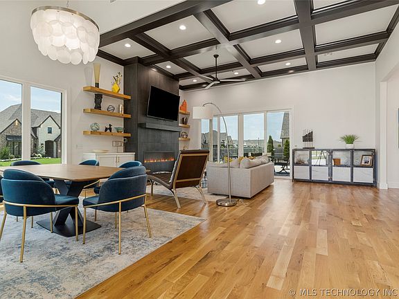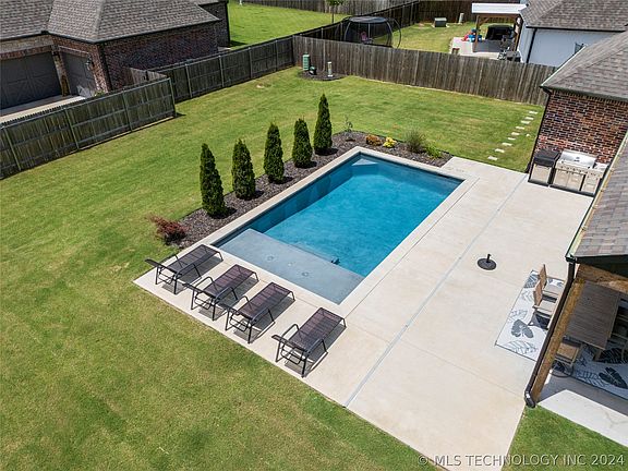 Custom, luxury, and dripping with appeal & lifestyle, over-sized corner lot with gunite pool, and outdoor entertainment space! Two story height in living and dining room, hardwoods in all spaces down, including primary & guest! Primary suite boasts a tiled shower, soaker tub, accent wall, and patio access. Kitchen makes a statement with waterfall quartz island, built in appliances, countertop to ceiling tile, and designer lighting. Floor plan: 2beds down and 2 up; or 1 up and flex room. Built in dog room down, floored attic, epoxy garage floors, tankless hot water, sprinkler system, tinted living room windows. Bixby Schools, neighborhood pool available, clubhouse, fishing ponds, and trails!