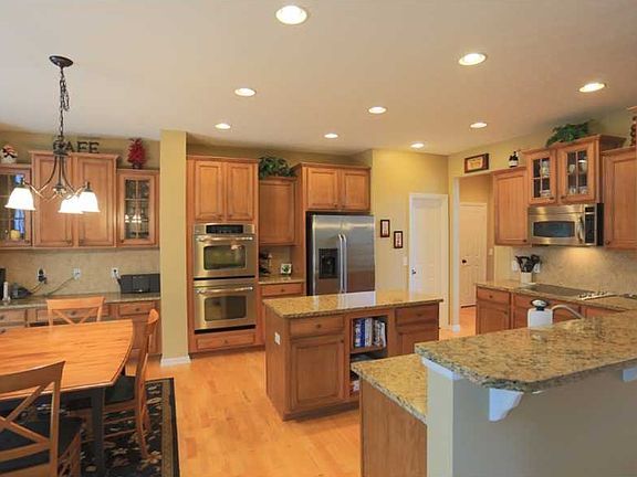 4 BR, split ranch home with open floor plan and 12' ceilings. New carpet and paint. Great room with gas fireplace and wall of windows. Updated kitchen with granite counters and stainless steel appliances. Large master with walk-in closet, double vanities, Jacuzzi tub. Bedrooms 2 and 3 feature walk-in closets. Fully finished basement with huge family room, full bathroom and 4th bedroom. Beautiful view of pond from stamped patio and deck. Private backyard with mature trees. HSE Schools.
