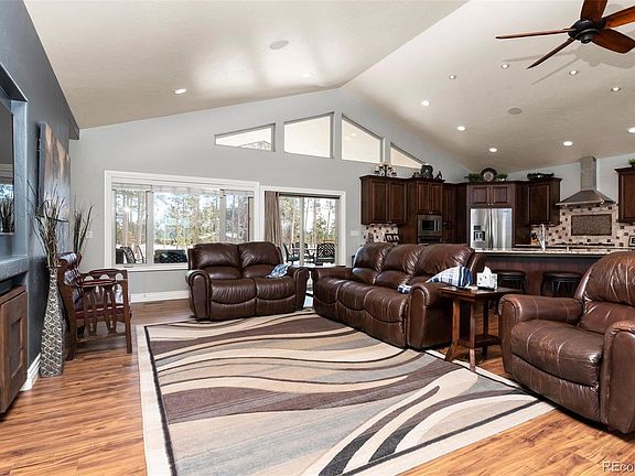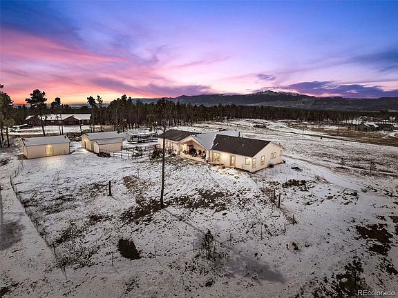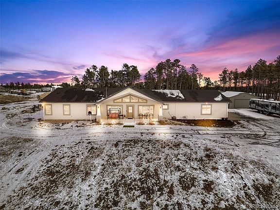 Sought after close-in Black Forest location! Custom built one level rancher with almost 3,000 square feet on the main level, 5 car garage, 25x30 finished and insulated workshop, tremendous Pikes Peak and full front range mountain views. The home is perched in a perfect location on 5 acres in award winning School District 20! Zoned for horses and other animals. Wheelchair accessible w/ no steps throughout home, wide hallways/doorways. Outbuildings and RV's allowed. Two main level master suites. Central air conditioning, knotty alder doors throughout, an abundance of large windows for tons of natural light. Gorgeous open concept kitchen w/ slab granite counters, huge island w/ seating for 5, stainless appliances, under cabinet lighting, upgraded cabinetry w/ crown molding, 5 burner gas cook-top and a pantry. Expansive great room w/ vaulted ceilings, tons of windows, gorgeous mountain views, recessed lighting, built-in speakers, walk-out to the patios and a wood burning stove with stone surround. The first master suite with spacious with a walk-out to the back patio, walk-in closet with custom closet organizer system, a 5 piece master bath. The master bath has a large soaking tub, double vanity w/ slab granite counters and tons of cabinet space, a over-sized shower with seamless shower door, two shower heads and a built-in bench. The second master suite has walk-in closet, beautiful mountain views, tons of windows, a well appointed bath w/ large shower, upgraded vanity w/ slab granite counters. Separate office with double doors. Theater room w/ walk-out which could be a larger office or possibly a 4th bedroom. Tons of outdoor entertaining spaces - two covered patios with recessed lighting and prewired for a hot tub. Two detached 25x30 garage/workshops with 200 AMP services, tons of electrical, insulated and finished. Fenced dog yard. No HOA or covenants. Very close to Section 16 and the new Pineries Open Space w/ miles of trails for hiking, biking or horse back riding.