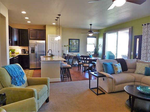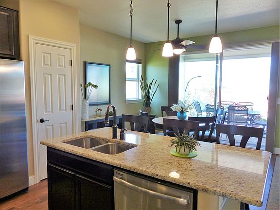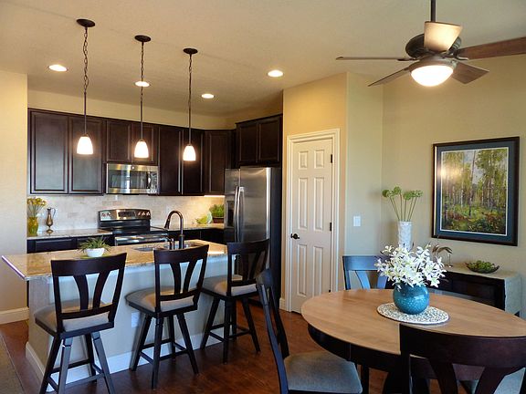 Spectacular home in premier 55+ community. Beautiful entry leads to open great room. Kitchen features fabulous upgrades: Creme Giallo Granite, Cherry Java Cabinets, Stainless Steel Appliances & tile backsplash. Dining area overlooks back patio & is open to living room. Spacious living room features gas fireplace w/ tile surround accenting backsplash in kitchen. Lovely formal DR off the entry. Master suite features tray ceiling, private 3/4 bath w/ huge walk in shower, walk in closet & access to back patio. Private guest suite at front of house features adj full bath & spacious bedroom. Basement fully finished & features large family room, 3rd bedroom w/adj 3/4 bath & rec area- perfect for pool table. Take in the mountain views from the back patio, draw the solar shades on hot, sunny afternoons & get cozy by the firepit on crisp evenings. Professional landscaping front & backw/ sprinklers; Home backs to brand new lodge with fitness center, pool and hot tub.