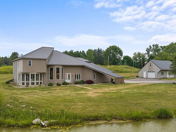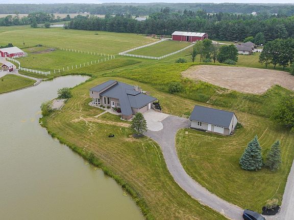 Welcome to 12727 Hardisty Rd, a luxurious modern retreat nestled on a private homesite spanning an impressive 6 acres in north Fort Wayne. This exceptional home boasts exquisite features and upgrades throughout, offering a truly opulent living experience. With 3 bedrooms and 3 baths, this residence is designed to provide both comfort and sophistication. The oversized sunroom invites natural light to flood the home, creating a warm and inviting ambiance. One of the standout features of this property is the brand new $40,000 metal roof, which not only adds a contemporary aesthetic but also ensures durability and longevity. The attached 2-car garage and detached outbuilding provide ample space for vehicles and additional storage. The oversized Trex deck, adorned with cable railing, offers a seamless transition between indoor and outdoor living. Imagine lounging here, soaking up the picturesque views while enjoying the gentle breeze and your own private beach. Inside, the attention to detail is evident. Solid bamboo by Cali Bamboo flooring throughout the home exudes elegance and durability, while brand new plush carpeting provides a cozy touch to the bedrooms. The high-end modern LED lighting fixtures illuminate the space, creating a captivating atmosphere. The soaring ceilings add a sense of grandeur to the living areas, providing an open and airy feel. The complete modern kitchen renovation is a chef's dream, featuring top-of-the-line industrial stainless appliances that combine style and functionality. The chef's cooktop and modern stainless hood are sure to impress culinary enthusiasts. The handcrafted butcher block top oversized island, capable of seating 8, serves as a centerpiece for entertaining guests and gathering loved ones. The new plumbing fixtures and modern cabinetry enhance the contemporary aesthetic. The master suite offers a sanctuary of relaxation, with a brand new hotel-quality luxury walk-in tile shower, exuding elegance and sophistication. Entertainment is taken to the next level with a wet bar and theater area on the upper level. Gather with friends and family to watch your favorite movies or sporting events in style, creating lasting memories in this exceptional space. The panoramic 100-acre views surrounding the property create a sense of serenity and tranquility. Located within the award-winning Leo schools, and minutes away from Parkview Regional Medical Center, parks, trails, shopping, restaurants and more.