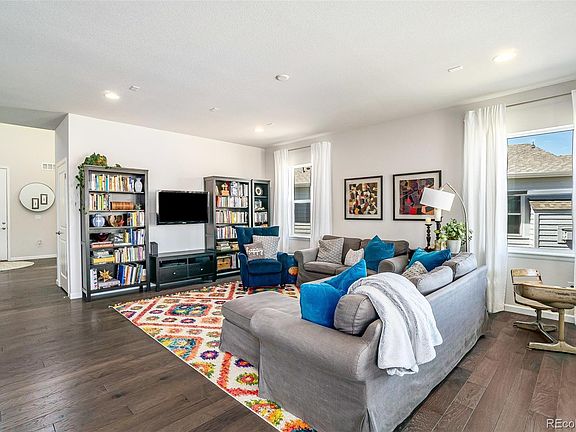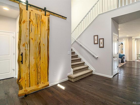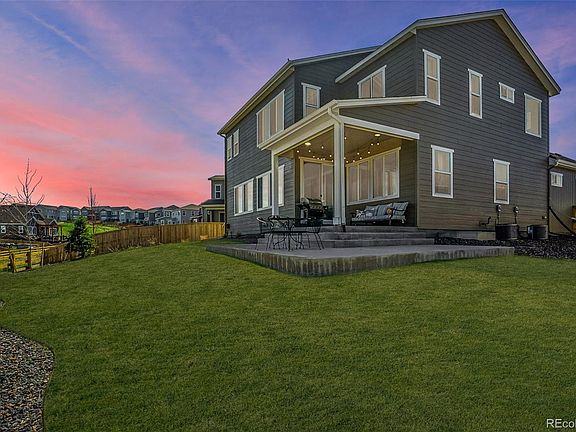 Beautiful, modern, nearly-new 2-story in Castle Rock's Terrain. Very light & bright, this home offers 5 beds, 4 baths, and a 3-car tandem garage. Chef's kitchen has stainless appliances, huge island/breakfast bar, granite counters, custom cabinets, 5-burner gas stove, double ovens, and commercial-style hood. Tucked just out of sight is a thoughtful kitchen office with access to enormous walk-in pantry. Master suite leads to a beautiful 5-pc spa bathroom and oversized walk-in closet. Bedroom 2 has its own bath, and Bedrooms 3 & 4 share a spacious Jack-and-Jill. Main floor office/guest suite is gorgeous and spacious. Covered patio in the backyard provides western sunset views and the professionally landscaped yard backs to a greenbelt. House is pre-wired for additional lighting/fans, and stereo surround sound on main. Extensive engineered hardwoods throughout main as well. Full, unfinished basement with 9 ft ceilings and unlimited possibilities. Nice sized lot with south-facing drive. Don't miss Terrain's multiple swimming pools, playgrounds, dog park, trails, and open space. All window coverings stay. Truly move-in ready. Welcome Home!