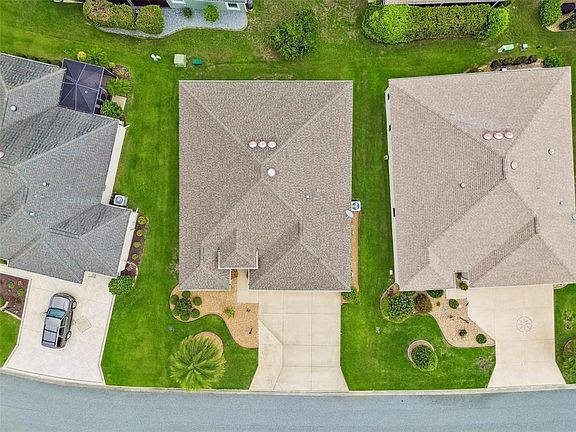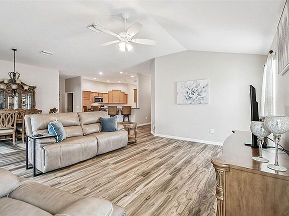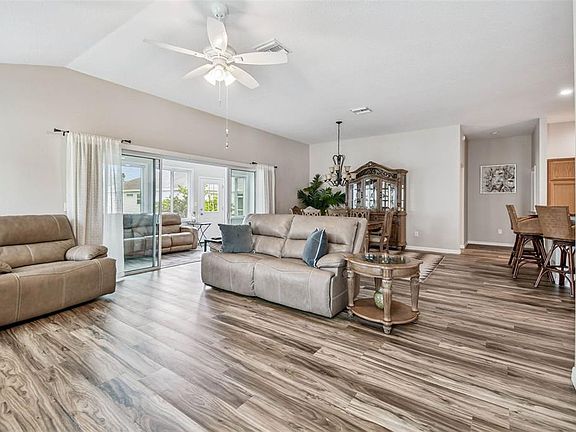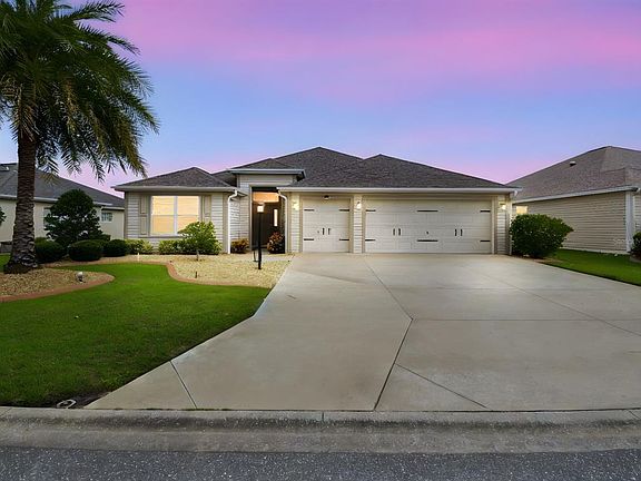 Under contract-accepting backup offers. Beautifully maintained 3-bedroom, 2-bath Designer Home with a 2-car plus golf cart garage in the highly sought-after Village of Dunedin. Perfectly positioned between Lake Sumter Landing and Brownwood Paddock Square, you’ll enjoy shopping, dining, and entertainment just minutes away. Curb appeal shines with an expanded driveway, rock beds, concrete curbing, gutters, mature upgraded landscaping, Zoysia sod, and a covered front entry. Inside, luxury vinyl flooring runs throughout with carpet only in the primary suite. The open floor plan extends into an enclosed and finished 28' x 9' temperature-controlled lanai—ideal for an office, exercise area, or den. The kitchen offers a large breakfast bar, stainless steel appliances, a French door refrigerator with dual ice makers, pull-out shelving, and a bright breakfast nook. The spacious primary suite features a tray ceiling, his-and-hers walk-in closets, and an ensuite bath with dual vanities, a Roman-style shower with decorative tile, and a private water closet. A pocket door separates the guest wing for added privacy, with two guest bedrooms—one perfectly suited as an office or flex space. The guest bath includes a tub/shower combo and natural light. The oversized garage has room for two cars, a golf cart (golf cart negotiable), a freezer, attic stairs, and generous storage. The laundry room is fully equipped with a wash sink and cabinetry. A stackable sliding door opens the living space into the lanai, and the split-bedroom plan enhances privacy for family and guests. An irrigation system keeps the lush landscaping thriving year-round. This home can be sold furnished, or furnishings can be removed if preferred. Close to Bradenton, Charlotte, Manatee, and Captiva Recreation Centers, Bonifay Golf & Country Club, Sarasota Golf Practice Range, and convenient shopping at Walmart Neighborhood Market and Publix, this home blends comfort, style, and a prime location. Start living The Villages lifestyle today.