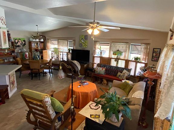 Three bedroom , Two bath , Manufactured home located in the back area of the Golden Oaks 55+ Community . High ceilings with cathedral windows and gorgeous views. Light bright and open living room flows into the dining room and kitchen. Custom window shutters in every room , laminate flooring in the primary bedroom suite and guest bedroom. Third bedroom features french doors and cozy carpeted room just off of the kitchen. The home offers central air and heat , automatic sprinklers , all appliances are included, large storage shed , huge porch and private patio area. The park features include Pool, Clubhouse, RV storage area, dog park and oversized community garden .