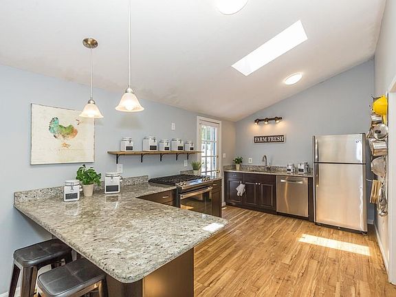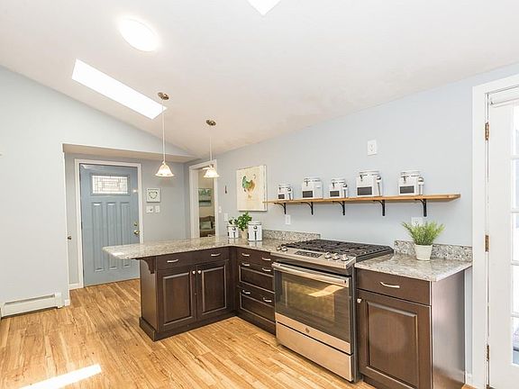 Please view the walk thru video tour and all the information on this wonderful home then schedule your appointment fast! This light and right home offers hardwood flooring throughout the bedrooms, hall, and living room /dining room combination! The vaulted kitchen with skylights has had a recent remodel of granite counters, new cabinets, and stainless steel appliances. The kitchen also offers access to the deck. The spacious open concept living/dining room area offers a wood stove and access to the vinyl fenced large back yard. The bathroom is beautifully remodeled. Three bedrooms with hardwood flooring and neutral decor. The full basement offers a playroom, and laundry/utility areas. The new washer and dryer will remain. All of this under a NEW ROOF! Other features are the 1 car garage, covered entry way and plenty of parking! Town water and sewer. Who will be the fortunate buyers of this great home? Due to the holiday weekend offers if any will be due by Tuesday 7/7 At 7