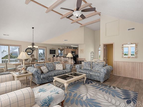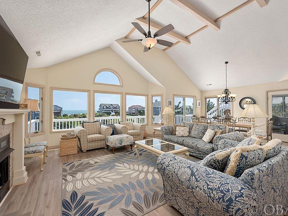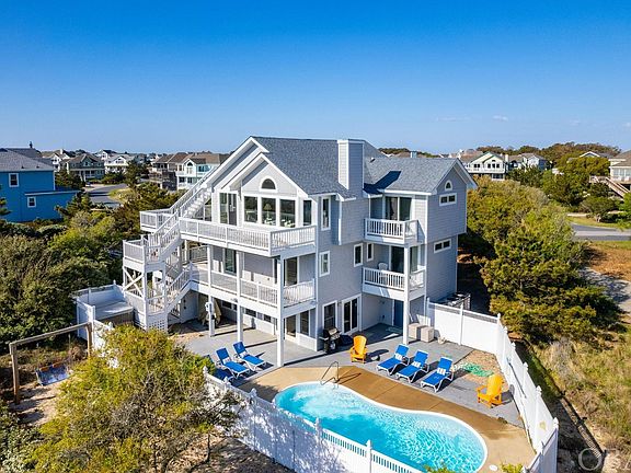 This vacation rental retreat with amazing ocean views offers 6 bedrooms, 5.5 bathrooms, private pool and hot tub, screened porch, and rooftop deck just 65 yards to the beach access. Located in the Villages at Ocean Hill, Beach Bliss boasts 3 levels of tasteful, serene décor in a reverse, open floor plan and practical layout. The upper level features a great room with vaulted ceilings, large windows to highlight the captivating ocean views, a spacious dining area (also with ocean views), and adjacent kitchen with breakfast bar, pantry, pickled oak cabinetry, and an ocean view. Easy access to the sun deck and screened porch allows for endless entertaining and dining options, or just relaxing. The rooftop deck is the place to enjoy breathtaking views of the Atlantic Ocean and incredible OBX sunrises. The primary en suite on this upper level also has ocean views, as well as a private oceanside balcony and private bathroom. A half bath and Luxury Vinyl Plank flooring are added conveniences buyers will appreciate. The mid-level brings two en suite bedrooms (each with their own private bathrooms), one with a private balcony with ocean views, and the other with access to the wide, sweeping covered deck. There are two more bedrooms, one of which shares the full hall bath and has deck access. The east side of the covered deck does offer ocean views from these three bedrooms. This level offers a variety of sleeping arrangements for the privacy and convenience of guests and is a favorite feature of rental guests. An inviting, custom tiled foyer sets the stage for the comfort and enjoyment this well-maintained has to offer. The ground level sports the final bedroom, a full bathroom, and the game room with a kitchenette. A comfortable TV area provides space to kick back and relax after a day at the beach or hanging out poolside. The 28x14’ private pool and hot tub are features every guest can appreciate. With plenty of space to spread out, there’s even room to set up the ping pong table poolside. Beyond this area, the owners have created yet another outdoor space perfect for corn hole, swings, or even horseshoes. The location of this property is ideal. Not only is Beach Bliss a short walk to the beach, situated on an X flood zone lot, and located within the Villages at Ocean Hill, but community amenities are also available. VOH offers oceanfront and sound front pools, tennis, volleyball, basketball and more. All the wonderful restaurants, shopping, and attractions of Corolla are also just a short drive away, including the famous Corolla wild horses in the 4x4 area. If you are looking for a lovely vacation home with captivating ocean views, an open concept reverse floor plan, en suite bedrooms, game room, private pool, and community amenities in a great location, this is the one.