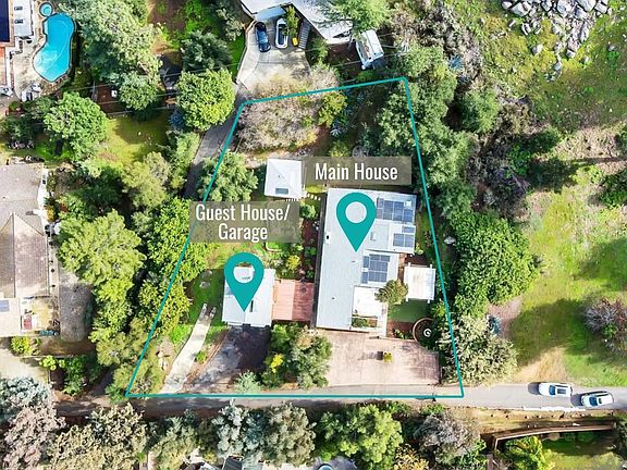 This exceptional Poway property features TWO detached houses on one large lot. Inside the 2,100 square foot 3bd + den/ 3 full bath main house, the spacious living room with high ceilings welcomes you with abundant natural light, creating an open and airy atmosphere. The home includes three bedrooms, three full bathrooms, and an office. The detached guest house is 671 square foot 2 bedroom 1 bathroom above a spacious 2 car garage. Step outside the kitchen to an inviting outdoor fireplace, perfect for year-round entertainment, and an expansive outdoor eating area, surrounded by nature. . Other amazing features: owned solar, electric car charging station, 2021 water heater, exterior "shed" with electrical, new carpet, new paint, two car garage, RV parking, and more.