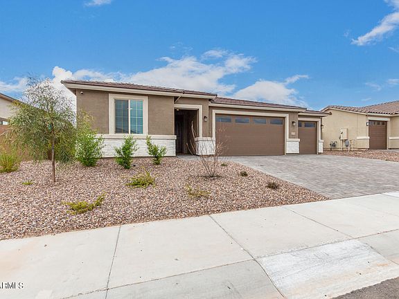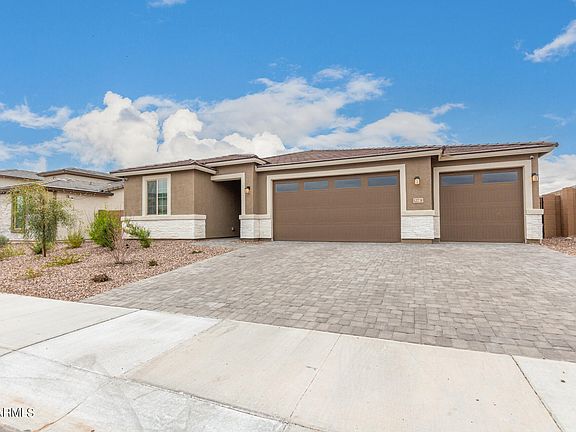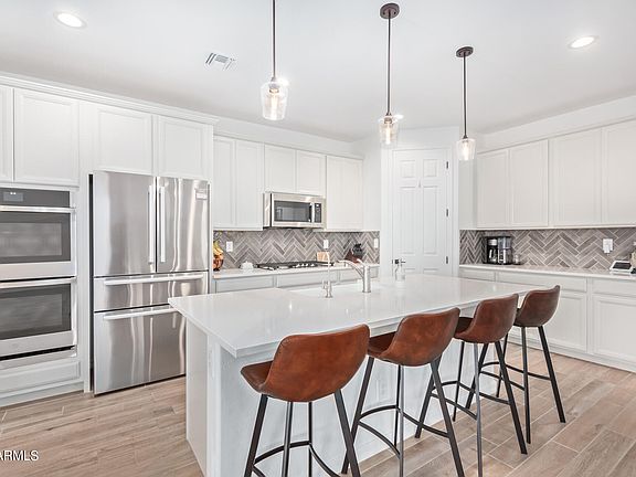 Wood look tile throughout the common areas of the home and plush carpeting in the bedrooms. The kitchen boasts stainless steel appliances, a stunning farmhouse sink in the kitchen, quartz countertops, a gas stove, double ovens and a large. The spacious open concept great room/kitchen give you plenty of room to entertain. The Primary suite includes a dual sink vanity, a tiled shower & tub a walk-in closet. The professionally landscaped backyard includes low maintenance synthetic grass and an extended paver patio. The 3 car garage gives you plenty of parking/storages space. Schedule a tour today!