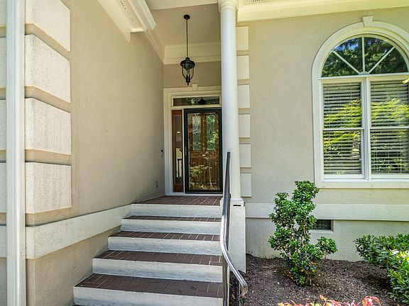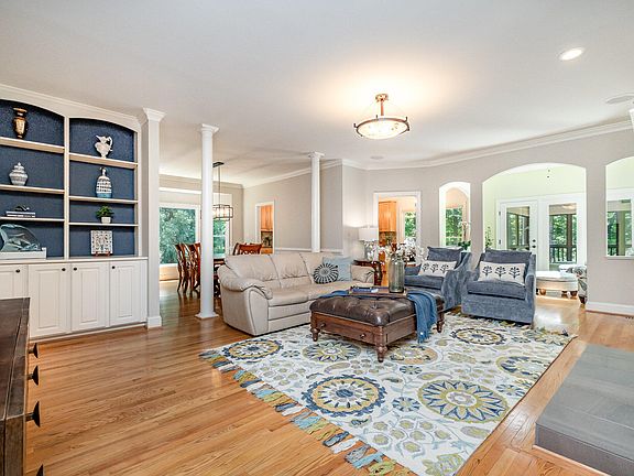 This beautifully maintained 4-bedroom, 3-bath transitional two-story home is nestled on a stunning 0.92-acre wooded lot and offers incredible curb appeal. Step inside to a spacious open floor plan adorned with gleaming hardwood and ceramic tile floors. The grand living room is anchored by a striking marble fireplace, while the elegant formal dining room—accented with architectural columns and a charming bay window—is perfect for hosting. The gourmet kitchen is a chef's dream, showcasing 42'' custom alder cabinetry, abundant counter space, a unique corner sink framed by dual sunburst windows, and a cozy eat-in area. The luxurious first-floor primary suite features a vaulted ceiling, Palladian window, whirlpool tub, separate shower, and dual vanities. Upstairs, you'll find an open loft-style bonus room with beamed ceilings, a wet bar, and an additional walk-up loft area—ideal for a home gym or extra gathering space. A private upstairs bedroom with a full bath adds flexible living options for guests or family. Additional highlights include 9-foot smooth ceilings, a screened-in back deck, fenced backyard with a brick paver firepit area.