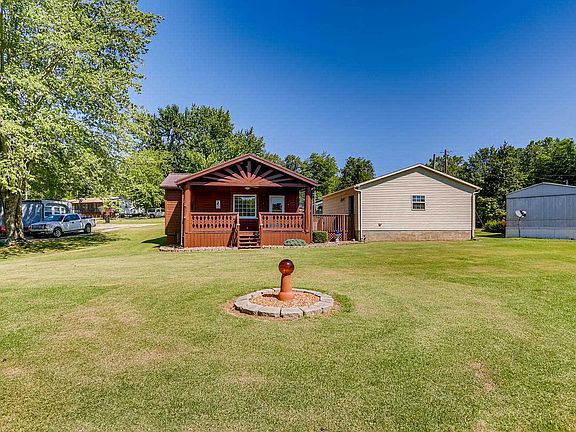 Lakefront Living! Panoramic views abound in this adorable 1 bedroom cabin on the lake at Yellow Banks. Step out onto your front porch and sip your morning coffee overlooking the gorgeous reflection of the sun on the lake and watch the moon rise while enjoying the cool breezes off the water. The open floor plan makes a great use of the square footage with a family room, kitchen, laundry area, bedroom, and full bath with walk-in shower. Don't worry about storage space as there is plenty of it inside the 2-car garage and bonus storage shed for all of your lakefront essentials. This charming home is larger than it seems with all of your outdoor living space to enjoy!